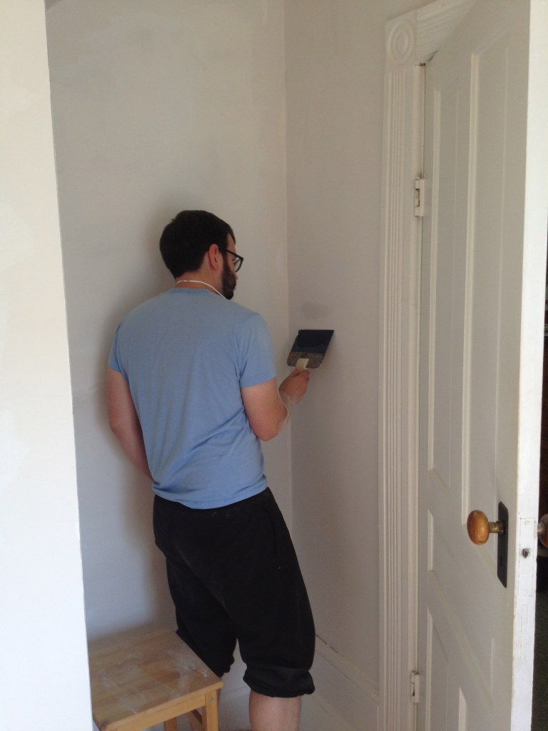 IMG_2681 Published October 8, 2013 at 2448 × 3264 in Electric baby blues JF, puttying the cracked bathroom walls